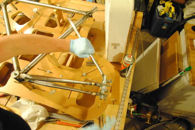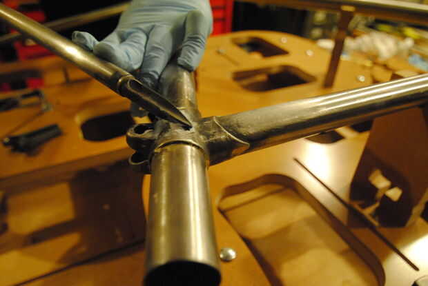 Los tubos pasados vamos a añadir a la estructura son las estancias del asiento. En este marco estamos utilizando enchufes (a veces llamados babosas) en el lado del tubo del asiento. Esto debe encajar y soldada en su lugar primero. Con eso hecho, la estancia de asiento puede ser áspero cortado a la longitud y final equipadas para los resaltos. El Jiggernaut utiliza un simple post para mantener que el asiento permanece en su lugar antes de soldar. Ajustamos este post para que las estancias toman el ángulo correcto y entonces podemos flux y soldadura al final de la deserción escolar y el extremo del tubo del asiento.