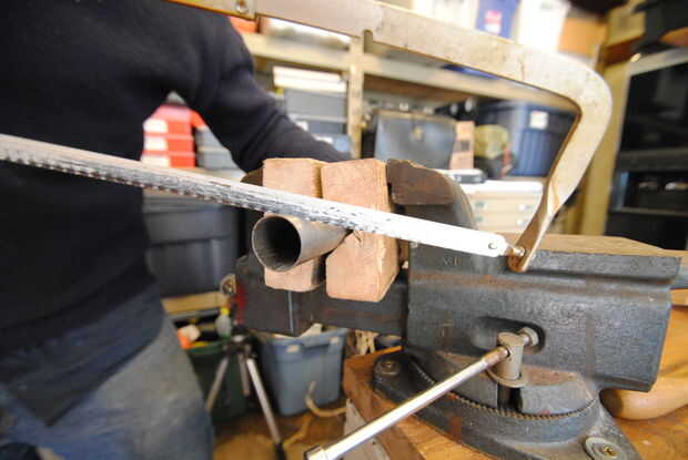 A continuación, sujete el tubo en una prensa de tornillo (con garras blandas). Tomar la sierra, hacer luz, cortes controlados que son tangentes al perfil trazado en el tubo. Está bien dejar un pequeño espacio entre el corte de la sierra y la línea trazada. Trabajar su camino alrededor de la circunferencia de la corte de tubo tan profundo al tiempo que aún dejando intacta la línea del perfil. Cuando haya terminado debe tener unos cortes ásperos alrededor del tubo. Siguiente corte axial desde el extremo del tubo hasta los cortes de perfil que acaba de hacer. Lo que estamos haciendo aquí es crear algunas piezas que pueden apalancar suelto.