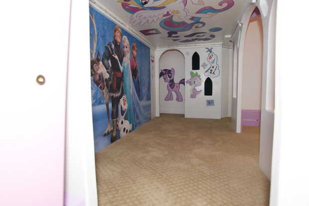 gran lienzo en blanco. Había planeado en pintar un mural en él, pero en aras de ahorrar tiempo he comprado un mural de "Congelados" de Fathead.com. También compré unas pegatinas My Little Pony también. Esto hace que la obra de arte fácil de cambiar y la cama y obras de arte se pueden mover fácilmente a otra habitación.
