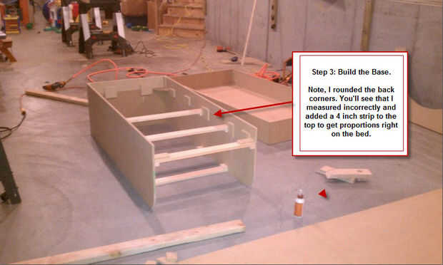 La base es más pequeña que la cama parte de usted en el paso 1. Es más estrechas cerca de 10 pulgadas (de modo que la parte superior cuelga sobre los lados de profundidad. También no es tan largo, pero la parte delantera debe quedar al ras con la parte superior de la cama.