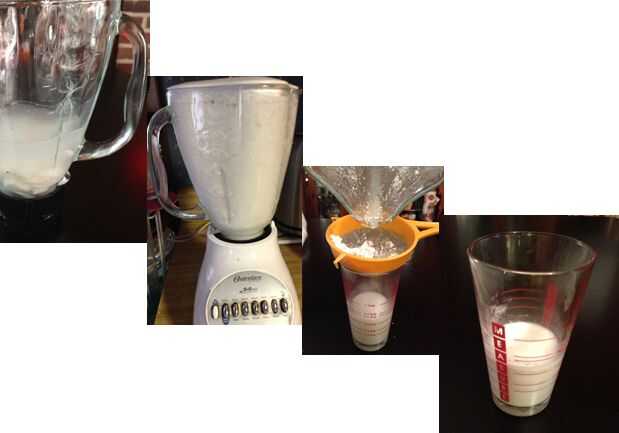 5. Colar la leche de la mezcla de cáscara de coco. Voila - leche de coco!