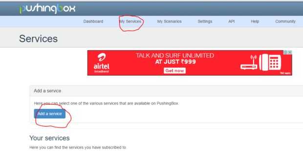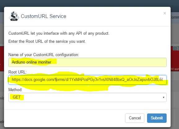 - Vaya vaya mi servicios y crear un nuevo servicio personalizado. Usted necesitará ir al formulario de google y enviar una respuesta. Esto cargará la página de respuesta del formulario. Copia esta URL y delante de ella en la pushingbox dirección URL de servicio de campo. El nombre lo que quiere y establece el método para conseguir. Hecho.