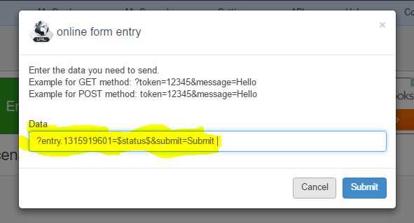 Cambiar el texto en negrita con su clave de forma que reunieron en el paso 2. ¿Deja la? y otras cosas, solamente sustituya la negrita con tus cosas. Ahora copia esa cadena todo haga clic en agregar acción y pasado en el campo de escenario de datos. Ahora haga clic en enviar.