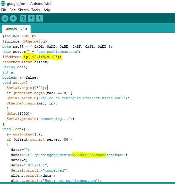 He adjuntado mi código muy simple para ejecutar este ejemplo. Usted encontrará una sección de cosas para ser editado. Este código envía las respuestas al formulario creado en el formulario de datos. Usted verá google entonces crea una hoja de cálculo y registra todas las respuestas con sellos de tiempo! Lo uso para crear registros de datos de temperatura, niveles de luz, humedad, movimiento de lo que quieras!