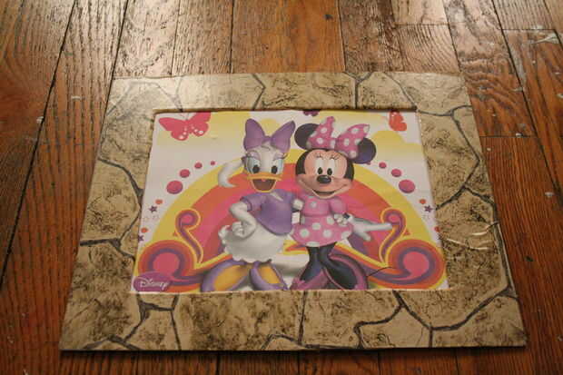 Ahora, hacer una copia de su foto favorita o la imagen agrandada en su computadora para que sea ligeramente más grande que el cartón. Recorta la imagen y pégala a la cartulina. También puede utilizar un cartel de tus personajes favoritos o grupo de música favorito. Estoy usando un cartel de Minnie Mouse y Daisy Duck. Luego, simplemente coloque en la parte posterior del marco con unos trozos de cinta!