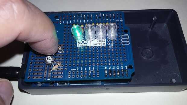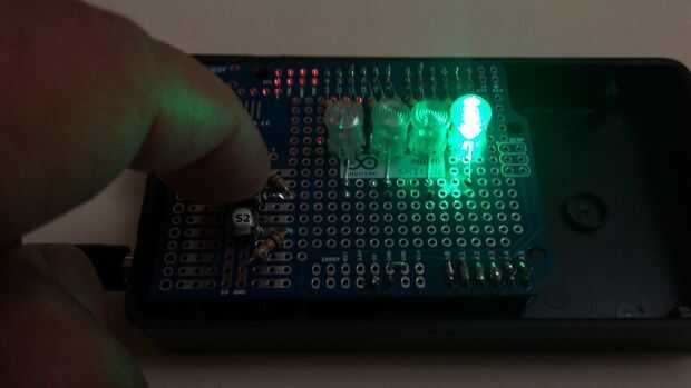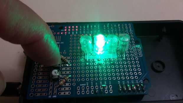 Presionando S1, la verde LED se iluminan y generan código binario de 1 a 15 (0001, 0010, 0011, 0100, 0101, 0110, 0111, 1000, 1001, 1010, 1011, 1100, 1101, 1110, 1111).