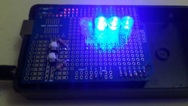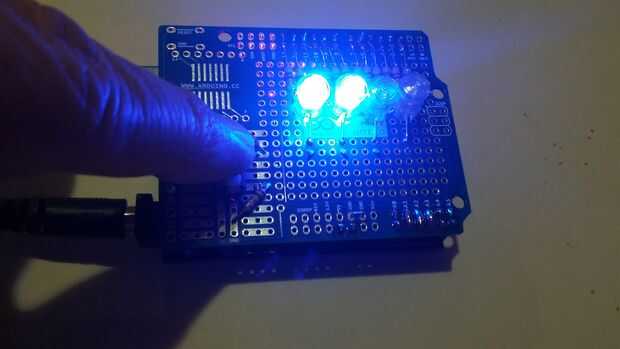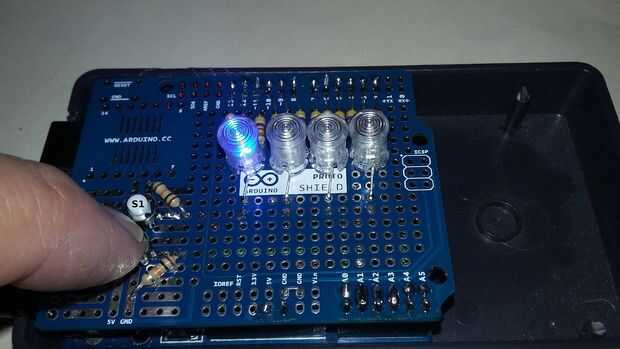 Presionando S2, el azul LED se iluminan y generan código binario de 1 a 15 (0001, 0010, 0011, 0100, 0101, 0110, 0111, 1000, 1001, 1010, 1011, 1100, 1101, 1110, 1111).