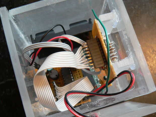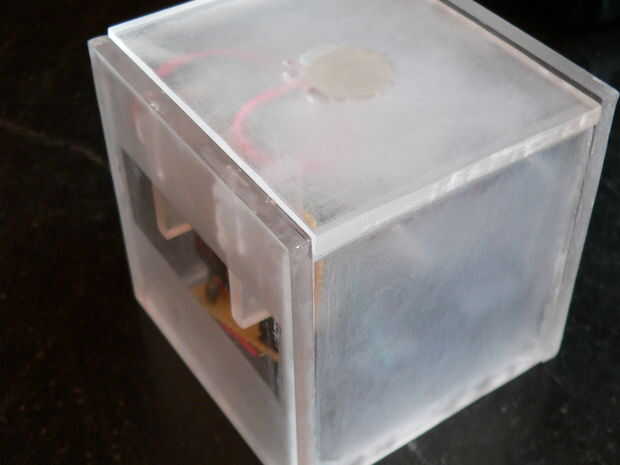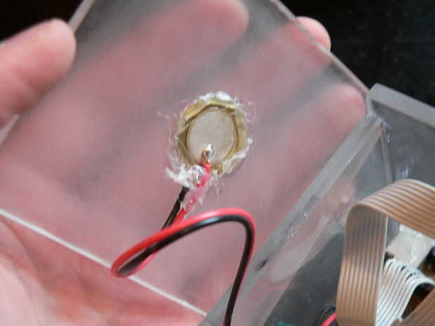 Cosas todo dentro de la caja, pegar el transductor piezoeléctrico para la tapa y el pegamento de la placa del microcontrolador principal en la caja, dejando la USB conector hacia fuera a través de un agujero cortado en la parte posterior. También, pegar la pantalla en la posición correcta, usando a separadores de acrílico. Enchufe en su transmisor, ejecutar el python del programa, y divertirse!