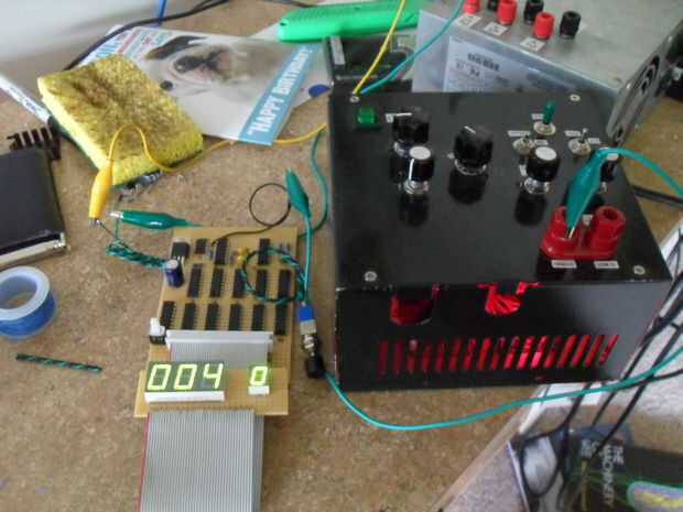 Esto se puede solucionar muy fácilmente, estaba sólo a perezoso para hacerlo. Le invitamos a probar sin embargo. En lugar de un cristal de 100 kHz, utilice un cristal de 1 MHz. Utilizar el contador BCD extra (recuerda, sólo la mitad de un contador BCD dual utilizado anteriormente) que dividir por 10. Esto hará que el tiempo de demora un orden de magnitud menor, resultando en un error de 1% en los de alta frecuencia en lugar de un error de 10%.