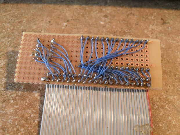 Tome la longitud de cable de cinta de 40 conector y encontrar una manera para quitar todos los cables uniformemente. Lo hice por anotar ambos lados con un cuchillo, entonces tirando firmemente de esta marca de puntuación con un destornillador de cabeza plana. Con bastante trabajo, el aislador debe empezar a llegar lejos del resto del cable, dejando 40 uniformemente, los alambres expuestos. Es necesario alimentar estos alambres en un trozo de 3 x 7.5cm de protoboard. Para hacer esto tuve que torcer a mano todos los cables poco, luego la lata con soldadura para hacerlos sólidos. Ya que los cables de cinta son separados por 0,05 pulgadas, el protoboard se espacian cada 0,10 pulgadas, tendrás que colocar sistemáticamente cada otro alambre en una hilera de agujeros, con los otros cables en la siguiente fila de agujeros. Haciendo esto por 40 alambres todos a la vez es un poco complicado, pero se puede hacer. Soldar en su lugar tan pronto como sea posible. No quiere perder todo ese trabajo.