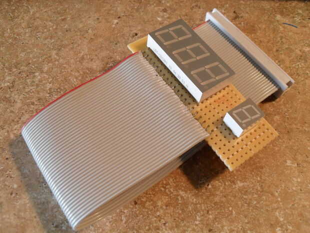 Segmento de lugar el 7 de 3 dígitos y 1 dígito se muestra en el pequeño pedazo de protoboard. He dejado 5 agujeros entre las pantallas grandes y pequeñas. Más tarde me voy poniendo una etiqueta en este espacio que indica que la cifra pequeña es un multiplicador del orden de magnitud.