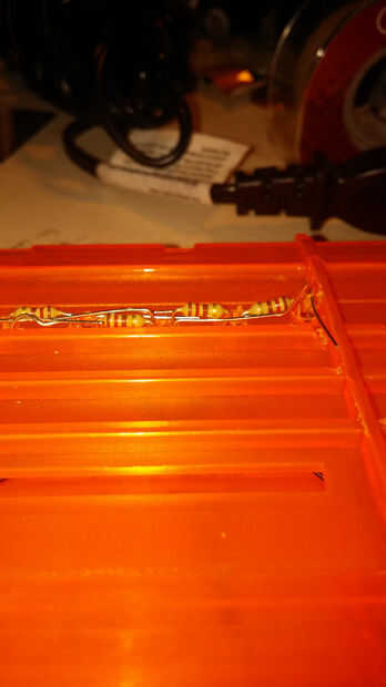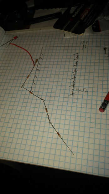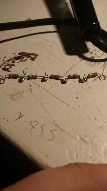 Luego tomar cinco de 120 ohmios resistencias, doblando los cables para que el ir en los agujeros y nuevamente hacia afuera. Una vez que cada agujero tiene alambre entrando y saliendo, soldar los cables entre sí, formando grumos blandos en los agujeros. Estos deben ser los puntos de contacto, así que trate de mantenerlos lo más suave posible. Además, porque los dardos deben viajar más allá de éstos, cualquier punto sharp coger los dardos y les impiden el movimiento en la revista.