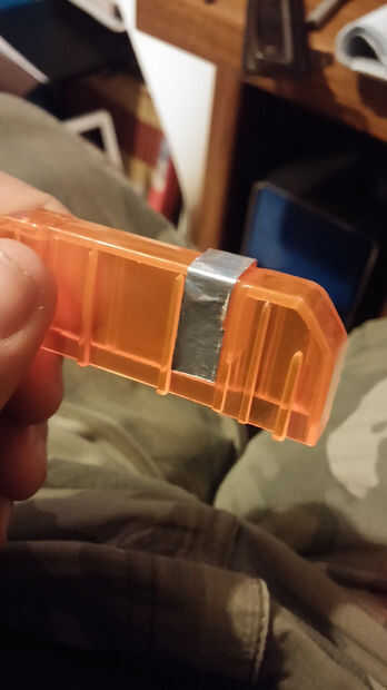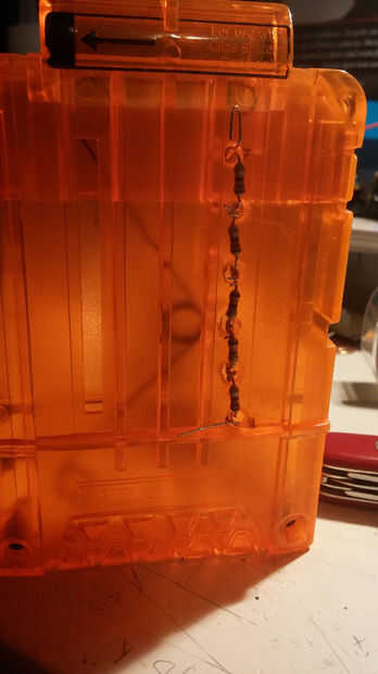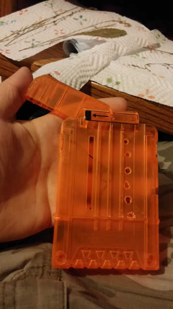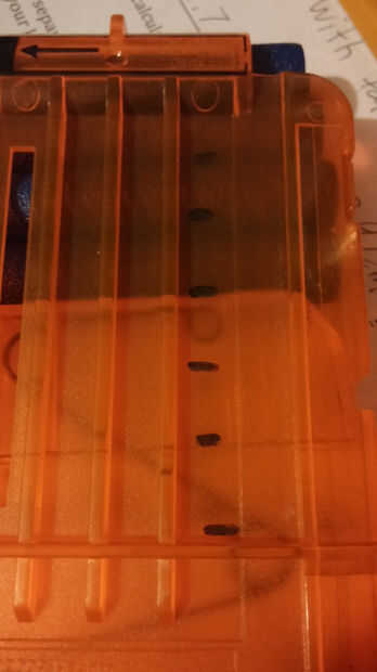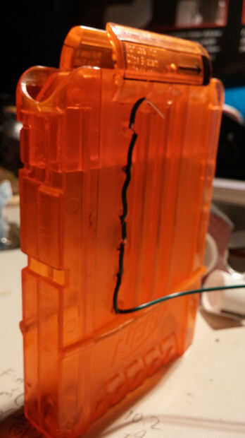 Para comenzar, carga de dardos un nerf revista, marcando cada posición de la barra en cinco tierras de imagen, como en la imagen dos. Marcar el borde de uno de los rayos de plástico por el lado de la revista, ya que esto hará que la electrónica más fácil la integración. Uno de los problemas es que si la electrónica se pega hacia fuera demasiado lejos, entonces la revista dejará de cargar.