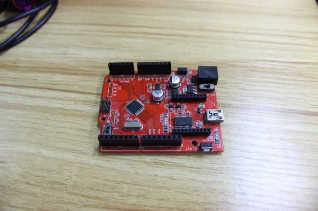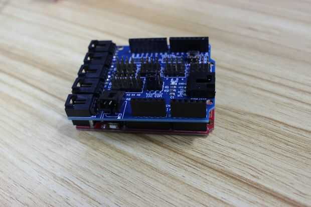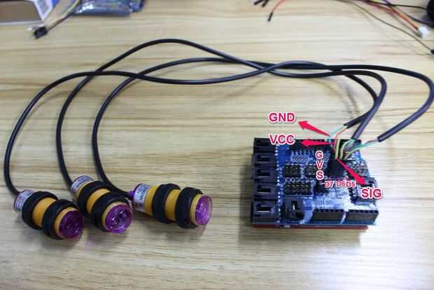 En primer lugar, poner el Crowduino de UNO sobre la mesa y luego conecte el protector del sensor Arduino sobre él. El protector del sensor proporciona comodidad para utilizar sensores, y podemos conectar los tres switchs de sensor infrarrojo ajustable sobre él fácilmente como demostración de los cuadros (D5, D6, D7 el puerto para conectar el uso). Parece que tres tentacless con tres ojos.