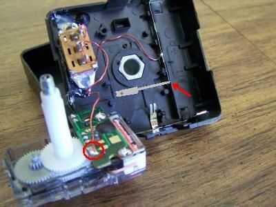 El conductor eléctrico de la punta de la batería (parte superior de la caja de la batería en la parte derecha de la foto) es una tira de metal brillante que se extiende hasta la flecha roja. Se me quitan parte de ella (se muestra en gris) de la flecha roja a la izquierda. Había hecho contacto con el área de la placa de circuito que se muestra dentro del círculo rojo. Puede ver el conductor de la terminal de base o negativo de la batería en el centro inferior de la caja de movimiento. He soldado un trozo de alambre de Magneto a lo que queda del conductor desde la punta de la batería y había conectado a un lado del interruptor. Al otro lado del interruptor está conectado por el alambre del imán hasta el lugar en el circuito en el círculo rojo. El movimiento es ahora controlado por el interruptor de encendido que he insertado.
