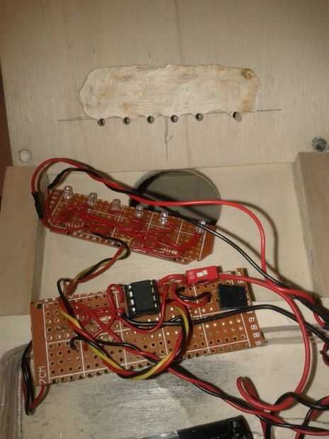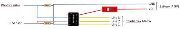 La "placa base" tiene ATTiny85, las resistencias para el sensor de luz IR y la fotorresistencia y todo lo conecta con la batería. Recomiendo usar un zócalo del IC para facilitar la reprogramación! También se incluyen un interruptor para encender y apagar la placa. Puede usar una batería con un interruptor en su lugar. La figura anterior muestra las conexiones. El producto real se ve menos impresionante debido a mis habilidades de soldaduras limitadas...