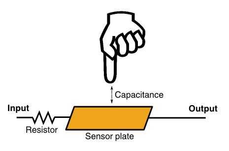 Cómo funciona es que hay una entrada y una salida con una resistencia y una placa conductora o papel entre ellos. Se aplica una tensión a la entrada y se mide el tiempo necesario para que la salida a la misma tensión. Si un dedo u otro material conductor está cerca de la placa hay una capacitancia que ralentiza el tiempo para que la salida a cambio de tensión.