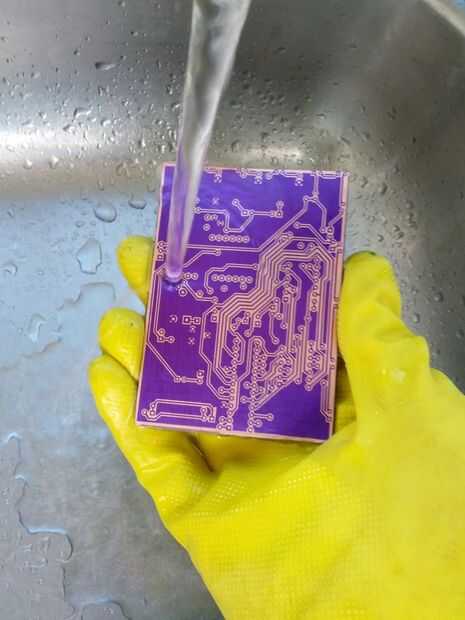 Una vez grabado, compruebe los rastros por malas conexiones y taladrar los agujeros con una broca muy pequeña.