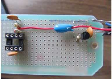 La soldadura del condensador de 100uF, 100nF condensador y 150kohm resistor en el circuito alrededor del transistor 2N3904. Fíjese en el pinout de los 2N3904 y la polaridad del condensador de 100uF. Hay un pequeño "+" en un lado del condensador. Conecte el otro extremo a tierra.