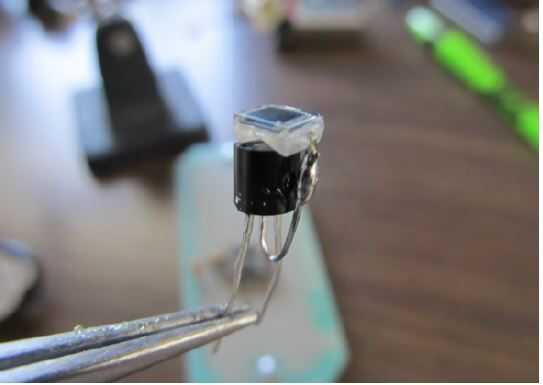 La sección de la pantalla de luz del esquema va a ser colocado en un tubo de cobre para ayudar a bloquear cualquier interferencia electromagnética y la luz que entra en el fotodiodo. Soldar los componentes en forma de tubo asegura un calce en el tubo de cobre. Comenzar colocando el fotodiodo en la parte superior el MOSFET 2N7000 y soldar la puerta (pin 2) al ánodo del fotodiodo (sin muesca).