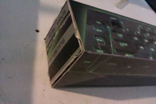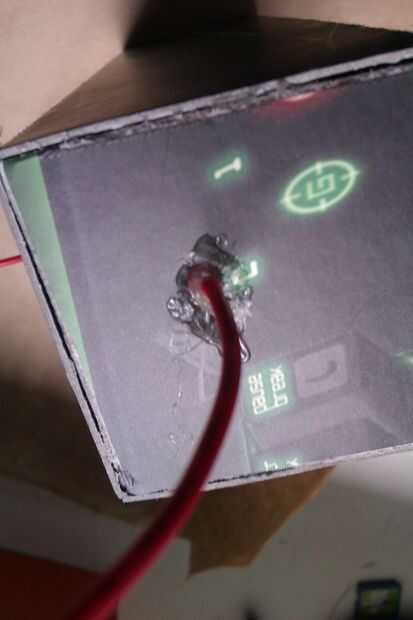 Al finalizar esto es cortar todas las formas y marcar las líneas de doblez (a ambos lados de la tarjeta). Esto hará que el doblar y pegado mucho más fácil. En tres de las plazas meter un pequeño agujero, lo suficientemente grande para un pedazo de alambre en. Teniendo sus tres longitudes de "fusible" atadura de alambre (uno rojo, uno negro, uno amarillo) un pequeño nudo en el extremo de cada uno y pase a través de los orificios de los cuadrados de cartulina (ver imagen 6). Para el paquete con el cable negro haga un orificio en el centro de un lado, y tomando su circuito pegamento dentro del paquete, frente al orificio. Teniendo los cables para el LED y el poderles pase a través de este agujero.