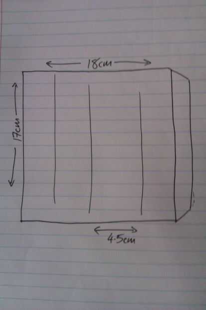 Para empezar, marcar rectángulos tres de 18 x 17cm en su tarjeta - dejando espacio para una aleta en un borde. Luego dividir el ancho de 18cm en cuatro secciones iguales de 4,5 cm, gobernando una línea cada frontera (esto es donde serán doblados). A continuación marcar plazas seis de 4,5 x 4,5 cm, con una aleta a cada lado.
