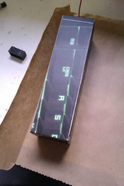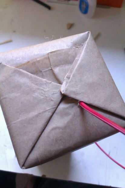 Las bolsas de papel marrón, despliegan en una hoja grande y extienda plana sobre una mesa. Tomar un paquete en un pegamento caliente tiempo una longitud de palo y papel a la tarjeta, gire 90° y pegue el lado siguiente. Repita hasta que usted ha envuelto el paquete con el papel. Luego tome el extremo sin el alambre y doblar cuidadosamente hacia abajo los lados (Foto 3), pegado abajo de como vas. Entregar el paquete y hacer lo mismo con la parte superior de la misma, sin embargo deja un pequeño orificio en el papel para el cable a de. Para el paquete medio deja un agujero en el medio del papel para la alimentación y los cables de LED empujar hacia fuera de.