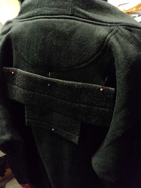 Colocar las piezas correspondientes de lazo/fuzzy velcro en su capucha. Coser alrededor con una costura estrecha y ancho zig-zag. Puede coser una línea en la sección interior del velcro para el refuerzo adicional contra el tirón de los parches.