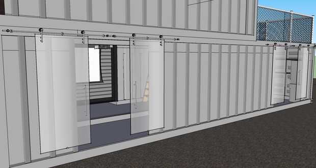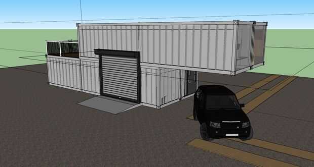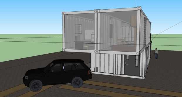 Estas son las principales vistas de la casa, cuatro cuarenta pies contenedores apilados y anclada a una base de hormigón. Los mejores dos contenedores se colocan más allá del punto medio de los envases de fondo y atornillados entre sí para mantener la planta superior donde debe estar. Una de las vistas muestra una puerta en el nivel superior de la casa y una puerta de garaje al lado. Es no para aparcar, pero para abrir la habitación principal. Sí, un land rover (parecía un coche accesorio) está estacionado en frente pero pueden aparcar debajo del piso superior donde está la puerta protegerlo. En la capa superior (donde usualmente hay una pared sólida) se ha colocado piso a techo de cristal que muestra en la oficina y el dormitorio. Apenas puede ver la cubierta en la parte posterior (la segunda capa), pero está ahí! Por último, la vista del lado adyacente muestra dos rolling rail cristal puertas industriales que entran en la habitación principal y cocina.