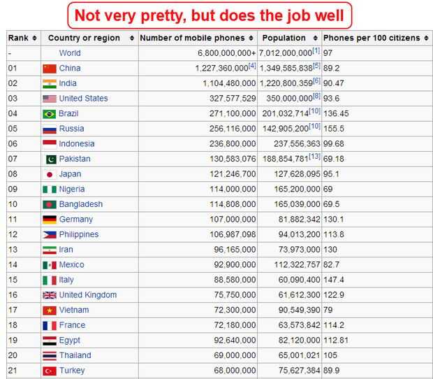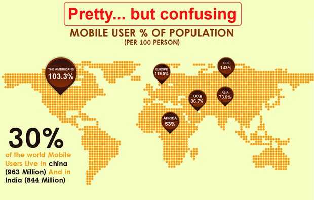 Por ejemplo, si desea a sus lectores qué país tiene el mayor porcentaje de uso del teléfono móvil puede usar un gráfico o un mapa. Sin embargo si usted utiliza un mapa necesita para asegurarse de que la gente podría fácilmente identificar una fronteras de países y compararlo con otros países. Aquí es un ejemplo de una visualización que usa una foto bonita, pero hace un trabajo pobre de transmitir su historia. Es seguido por una hoja de cálculo muy simple que hace un trabajo mucho mejor de transmitir el mensaje.