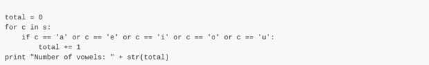 Después de haber introducido el código en la caja, hay una opción para verificar tu respuesta por debajo de la caja en que había pegado el código. El programa debe imprimir 5 puesto que hay 5 vocales en el código s = 'azcbobobegghakl' (dos de un, uno de e, tres de o). Sin embargo, esto no es la salida correcta. La salida correcta está en la foto y debe ser la salida que había recibido. Si no recibiste esta salida y haces esto en el ritmo sugerido, el graduador mostrará lo que había hecho mal.