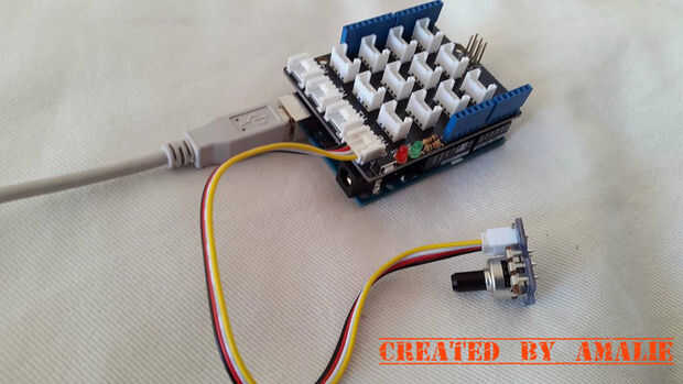Conectar tu escudo en base a la placa arduino, luego use el cable Universal 4 pines grove para conectar el potenciómetro a tu escudo base PIN A0.
