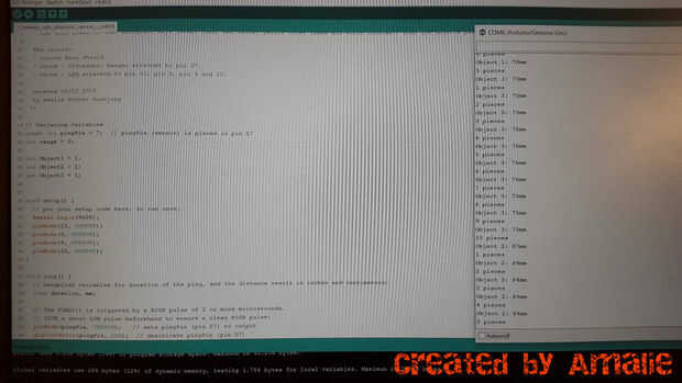 Cuando haya subido el código a tu Arduino debería ver una pantalla similar a la imagen, al abrir al monitor serie. Los LEDs parpadean diferentemente dependiendo de qué objeto pasar el sensor de ultrasonidos.