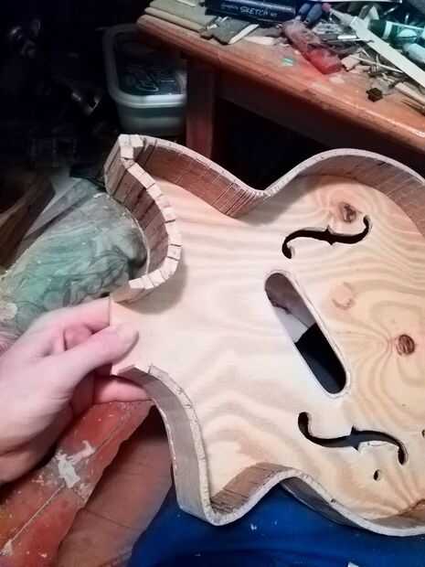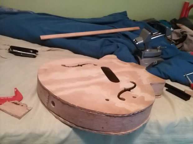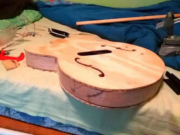 Después de que fue hecho, pegué los lados del cuerpo en la parte posterior de la cara frontal. Lo hice en 3 partes porque no tengo pinzas que muchos. Después de esto se hizo, hice el resto de las áreas de la parte de guitarra con pequeños bloques de madera. Estos bloques fueron un palo de fuegos artificiales de 8 x 8 mm que trocear unos 18 igualmente larga, entonces planeado para caber juntas. Después de eso, había pegado todo en como se muestra. Sólo lo hice porque no tengo suficiente madera para ir todo el camino alrededor del cuerpo. Recortan esta madera hasta parecía limpia, y de modo que el cuello podría caber perfectamente entre las partes.