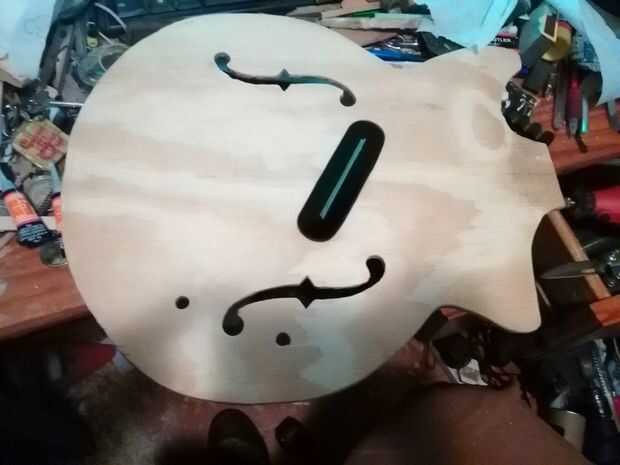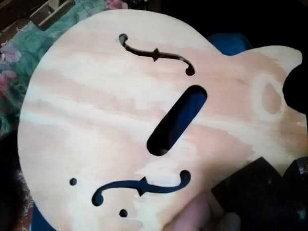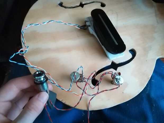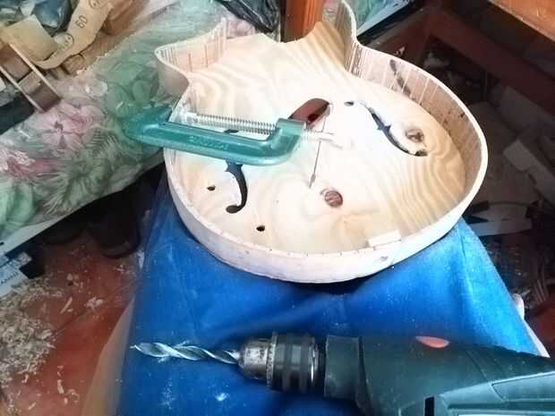 En primer lugar, taladré un agujero en el centro de la parte del cuerpo más alejadas del cuello. Este agujero fue hecho para el montaje de la toma de salida. No permanentemente Monte todavía, aunque. Porque mi guitarra tenía lados delgados, reforzó esta parte con otro trozo de madera sobrante y perforó un agujero a través de, también puede verlo en el cuadro 5. Esto sólo hace más difícil a rip accidentalmente hacia fuera el conector y el cableado cuando intenta desconectar la guitarra.