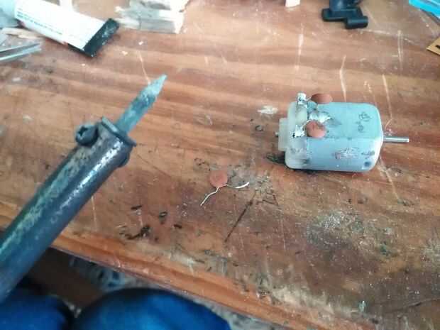 -Soldar un condensador de cerámica de 401 de un motor como se ve en la segunda foto. Entonces esto utilizado en lugar de.047 uno en el diagrama de cableado, ya que era el condensador más cercano que pude encontrar en casa. Tengo el motor de un coche de juguete de control remoto roto.