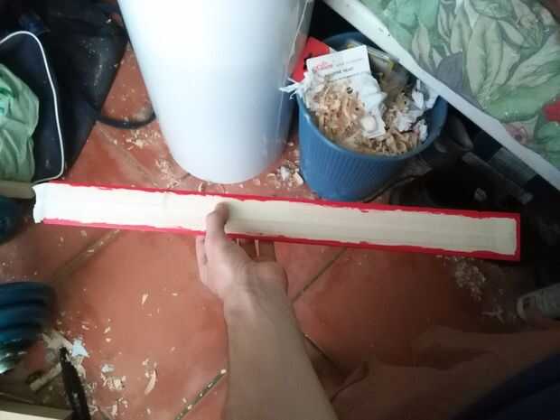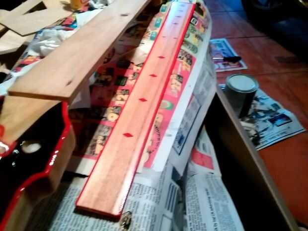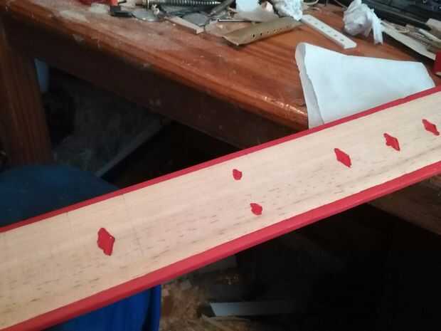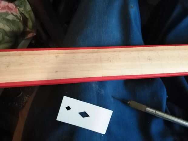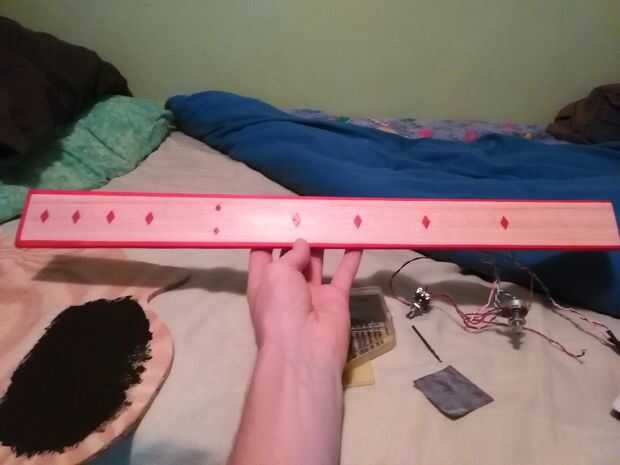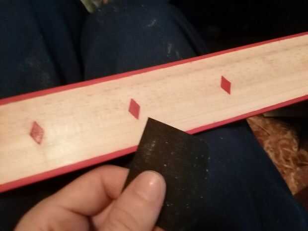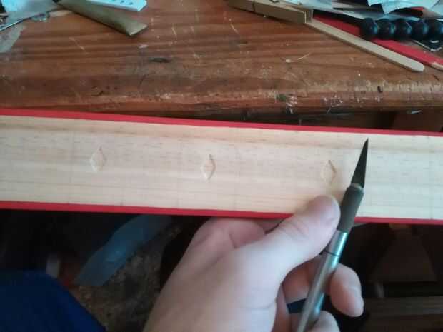 Una vez seca la pintura, hice cortes en la madera en donde se inserta mi marcador de traste "incrustaciones". No tengo ningún material conveniente para hacer convincentes incrustaciones de color que me ha gustado, así que cortar formas salen de la tarjeta del traste 1-2 mm de profundidad y relleno con pintura roja. Antes de que podía hacerlo, tenía que saber donde los marcadores deben ser. Calculé donde mis trastes estaría utilizando esta calculadora de traste en línea: https://www.stewmac.com/FretCalculator
