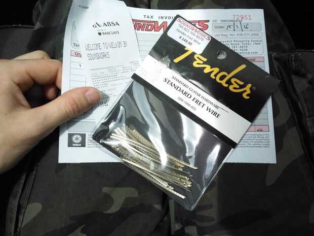 Antes de comenzar mi tablero del traste, compré algunos alambre de traste estándar de Fender, 24 trastes cortadas me costaron el equivalente a unos US$ 10 o menos. Habría preferido un rollo barato de cable, pero en ninguna parte cerca me hizo comprarlo de esa forma.
