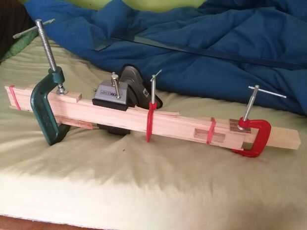 A continuación, he usado dos trozos de madera, sobre Plaza de 8x8m m en sección transversal y 700mm de largo. Me cortan a la misma longitud que la parte principal de la Junta de traste y utiliza planos de madera y papel de lija para estrechar en un extremo, de modo que cabrían aproximadamente al ras con los bordes del cuello. Luego pega y sujeta estas tiras de madera a los lados de la parte principal de la Junta de traste, usando cuatro abrazaderas y un par de gomas. Una vez este pegamento seca (alrededor de 8 horas más tarde) he añadido otra parte, de las mismas piezas de madera, se muestra en el cuadro directamente después de la que muestra la sujeción en la parte más ancha de la Junta de traste. Los extremos de esta pieza se lijar al ras con las tiras de madera exterior. No preocuparse de bloqueo, pero lo dejó por unas horas secar adecuadamente antes de proceder.