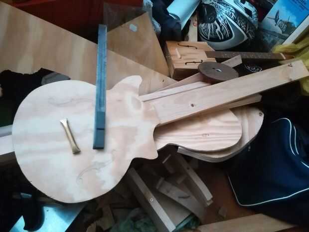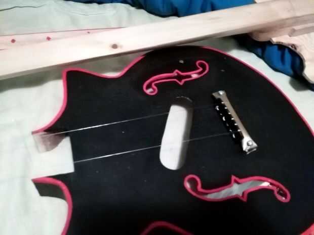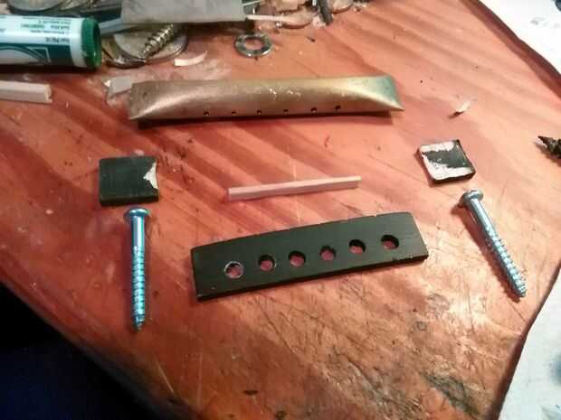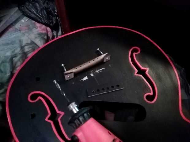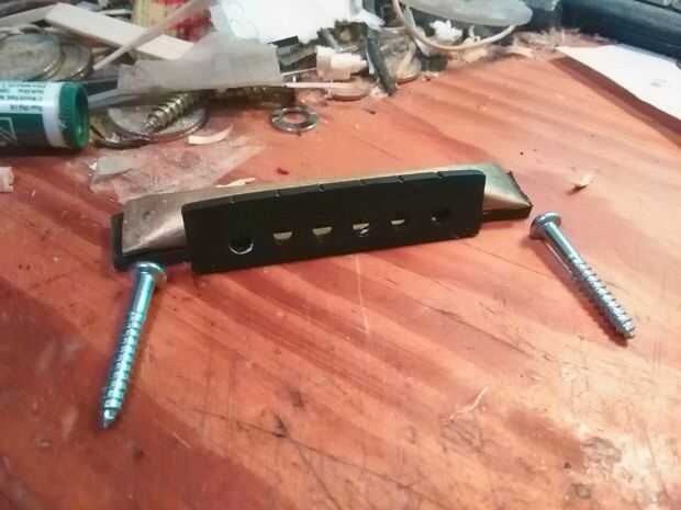 Entonces medí como precisamente como podía y los orificios perforados en el cuerpo en la silla de montar tenía que ir. Luego atornilla en aproximadamente y probado con línea de pesca en lugar de cuerdas de la guitarra, a ver lo bien centrado era. Una vez que se hizo, lo tomé de nuevo.