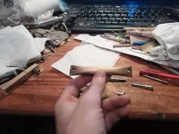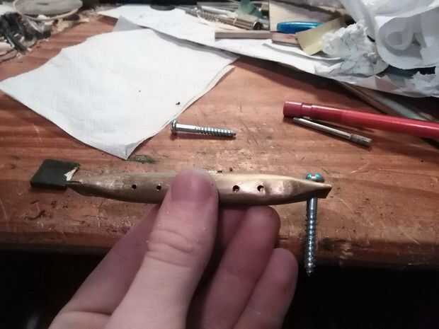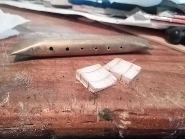 A continuación, hice dos partes poco para ir entre los extremos del tubo de latón y cuerpo de manera que se veía mejor y no sería capaz de mover. Usé madera de 3 mm de espesor, cortar dos de 16 x 16 casillas y utiliza el taladro en ángulo con un cilindro de papel de lija, para formar a encajar los extremos afilados de la pipa. Luego pinté estos bloques negros para que no queden a menos.