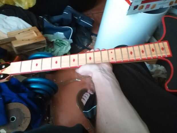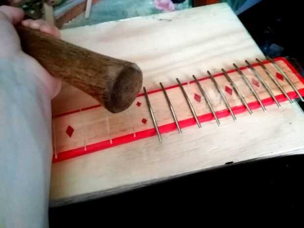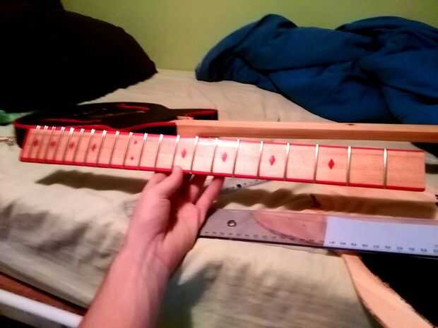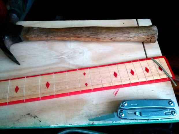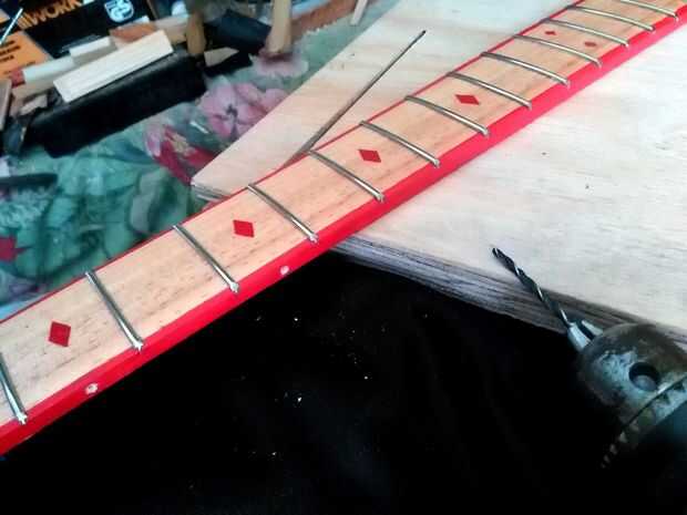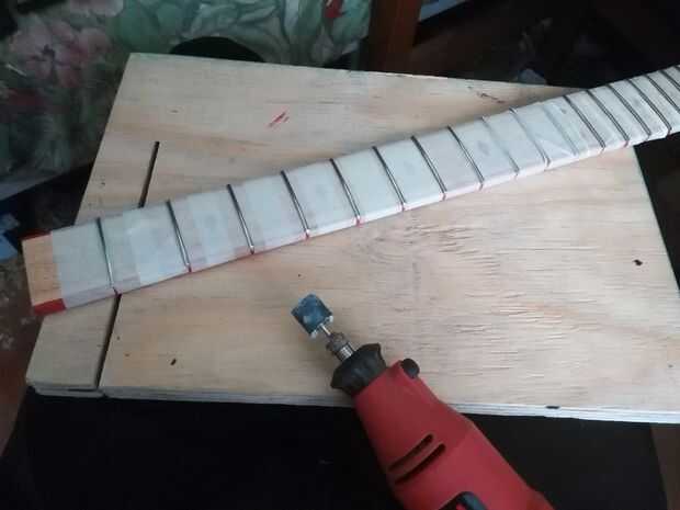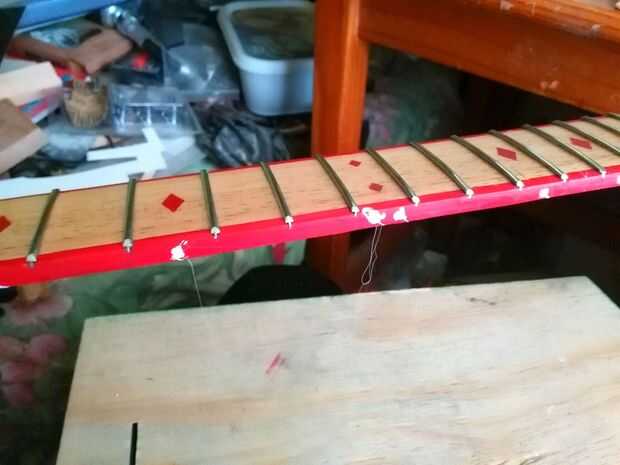 Una vez todo es satisfactorio aun, es el momento de poner algunos trastes en el tablero del traste. Lo hice colocando los trastes sobre sus lugares y ligeramente con la parte inferior de un martillo madera que golpee en su lugar y enderezarlas ligeramente de su curvatura original, por lo que cabrían cómodamente contra el tablero del traste.