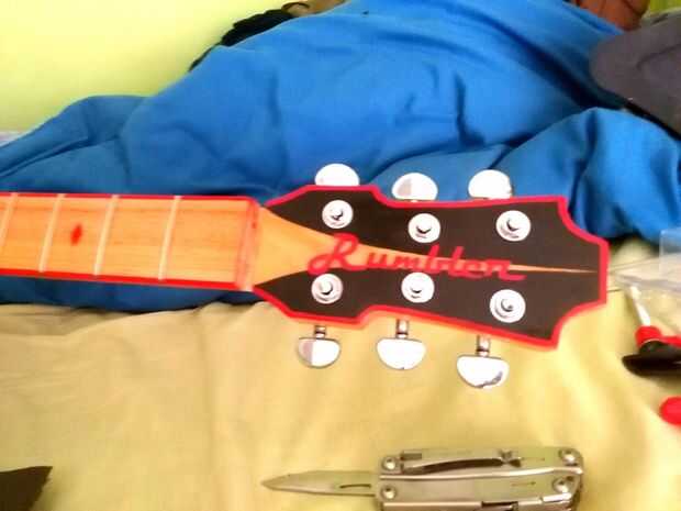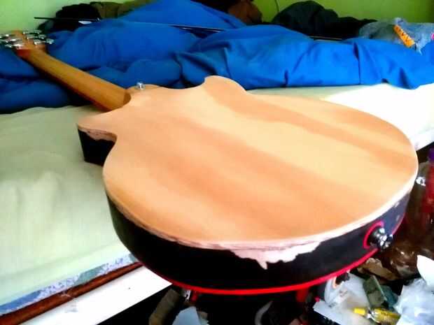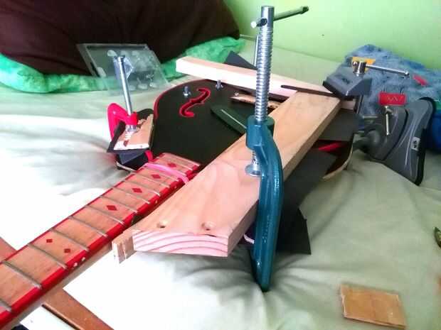Luego pegar la base del cuello a la parte superior del cuerpo y atornillado en la cejuela del puente para ayudar en la sujeción de las dos piezas de madera juntos.