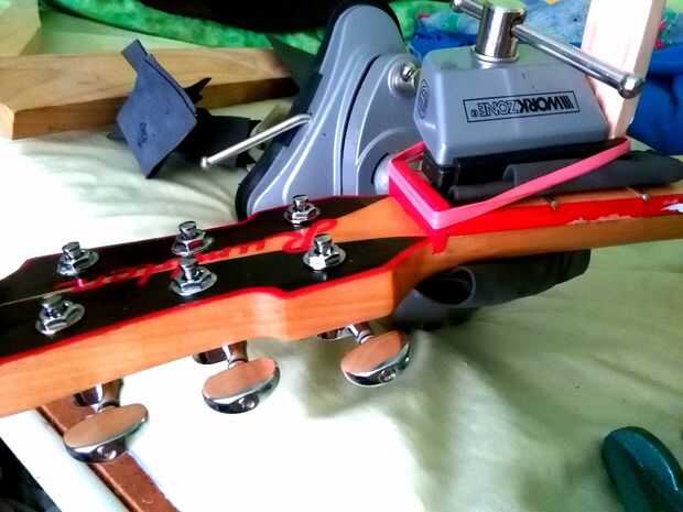 Dejé esto durante unas 12 horas antes de proceder. Al colocar el tablero de trastes en el cuello para pegar, temporalmente, coloque la tuerca en su lugar para que el tablero del traste se colocaba exactamente. Sólo pegué en más tarde aunque, como debían ser adjuntas firmemente y había usado todos mis pinzas en el cuello ya.
