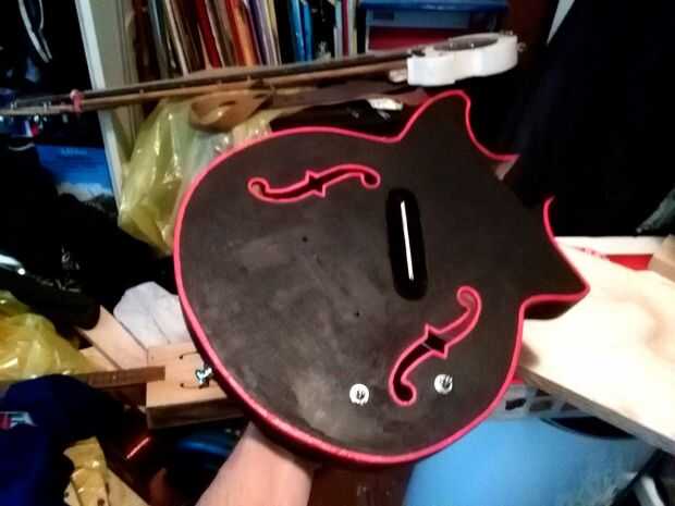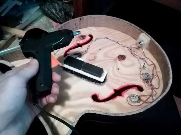 Comencé utilizando una pistola de pegamento caliente para pegar la recolección y el cableado en su lugar en el interior de la cara superior. Luego probé la electrónica después de soldar los cables correctos para la toma de salida. Funcionó bien, pero no prueba las perillas de tono y volumen y ahora que mi guitarra está pegado cerrado y no puedo acceder a ellos, mi perilla del volumen no funciona. Aprende de mi error. Obras en volúmenes completos de la mina y puede activarse con el mando, pero en todas partes entre completamente abiertas y completamente cerradas en un zumbido ruidoso.