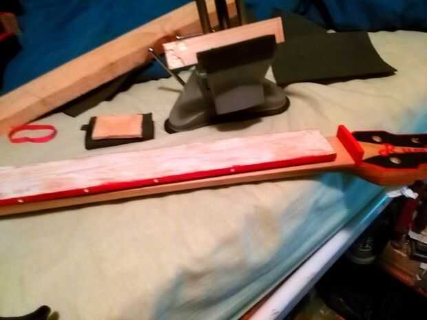 He pegado en el tablero del traste y pegadas en su lugar, otra vez usé cola blanca para madera. Tenía que asegurarse de que solía mucha goma espuma tanto en la parte superior de la Junta de traste y la parte posterior del cuello, para no rayar el cuello o deformar los trastes con la aplicación de las pinzas.