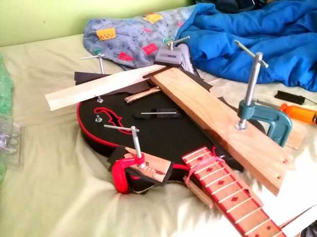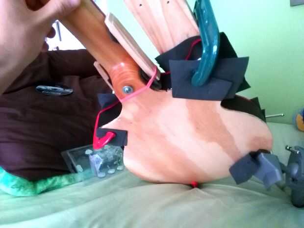 Luego pegué la parte inferior en muy rápidamente y mediante mi cuatro abrazaderas y algunos estratégicamente coloca trozos de madera, sujeta la parte superior y parte inferior del cuerpo juntos y al mismo tiempo pega el cuello a cada una de ellas en el interior. Usé un montón de hoja de goma espuma aquí demasiado, para evitar estropear la pintura demasiado o abollar la superficie. He dejado esto un día se seque. Es muy importante que va donde sus abrazaderas irá previamente, o su cola no puede secar cuando debe. También es importante que hagas seguro sin cables en el camino antes de que usted fije.
