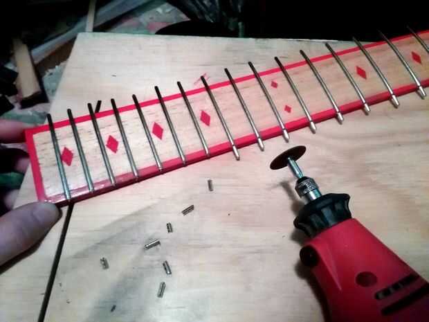 - Fina madera para el diapasón (utilicé recortes de pino nuevo, pero recomendamos arce o palo de rosa) tenía 750 x 45 x 7 mm para trabajar con. Te recomiendo que en vez de 45 mm de ancho, que tienes madera de 50-60 mm de ancho.