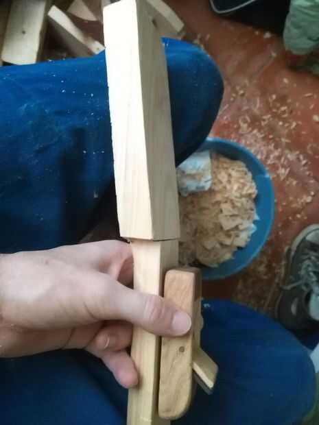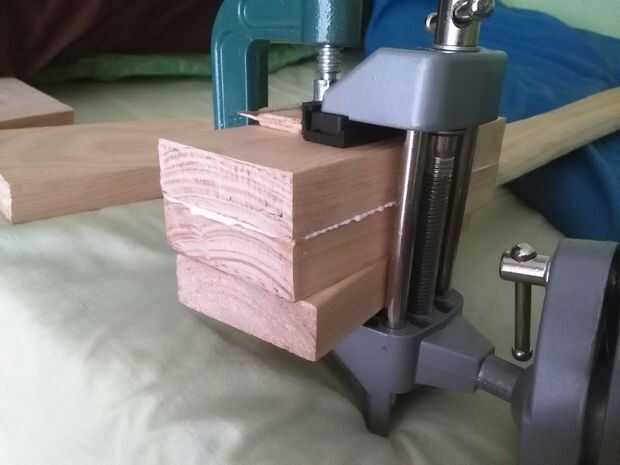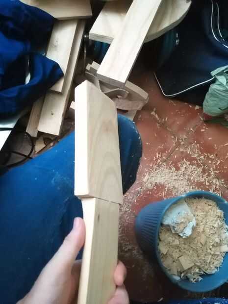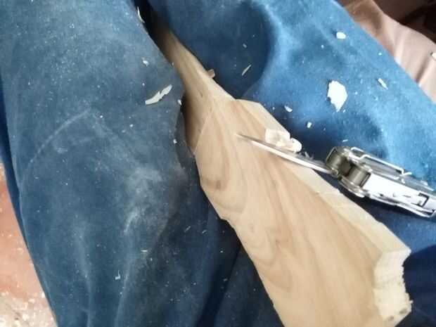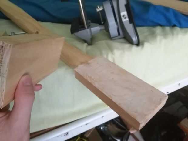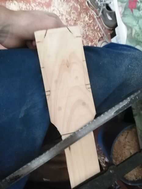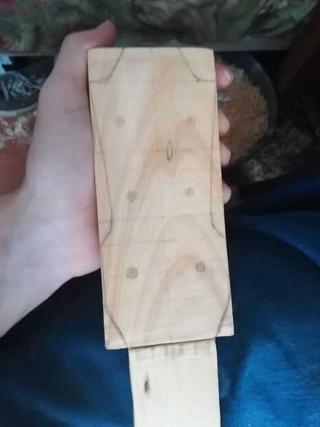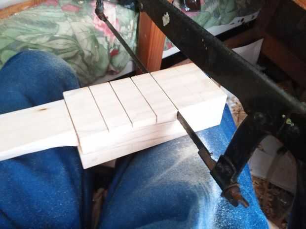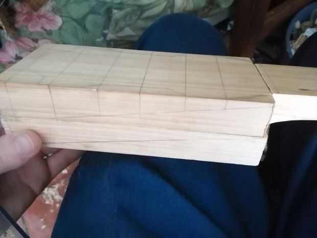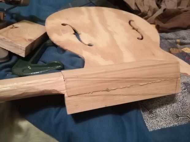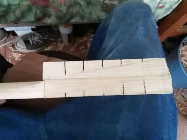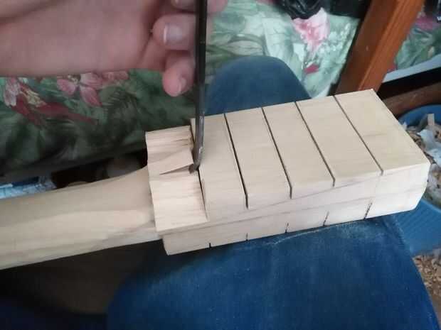 A partir la tabla en forma en el cuello, cortar una parte de otra tabla del mismo ancho y altura. La longitud de este bloque fue de 160 mm. Después había pegado a la parte posterior de la porción existente de "cabeza" del cuello, lo sujeta y el pegamento se seque durante un día y medio a la izquierda. Si hay algún espacio entre las dos piezas de madera se pegan, hay una buena probabilidad de que al afinar la guitarra el jefe dividirá y rotura.