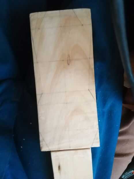 Una vez bien seco este pegamento, dibujó en él con un lápiz como se muestra en la tercera foto. La distancia perpendicular entre el lápiz líneas deben estar entre 15 y 18 mm, porque este es el grueso que más cabezas de la máquina se hacen para caber a través. El ángulo entre la superficie plana frontal del cuello y la cabeza "doblada" es en algún lugar entre 9 y 12 grados en mi guitarra (no tiene un transportador para medir).